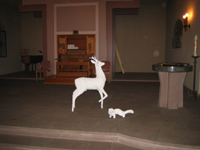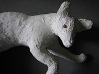Für den 1. Kirchentag Mensch und Tier gefertigte Tierfiguren. Sie symbolisieren dass sich unser Bewusstsein gewandelt hat. Weiß, unschuldig und frei von menschlichen Vorurteilen, kommen Wolf, Katze, Pferd und andere Tiere durch die dicken Mauern und dem massiven Bodenfundament der Pauluskirche. Vorsichtig sichernd schauen sie sich um, immer bereit zur Flucht. Noch trauen sie dem Menschen nicht.